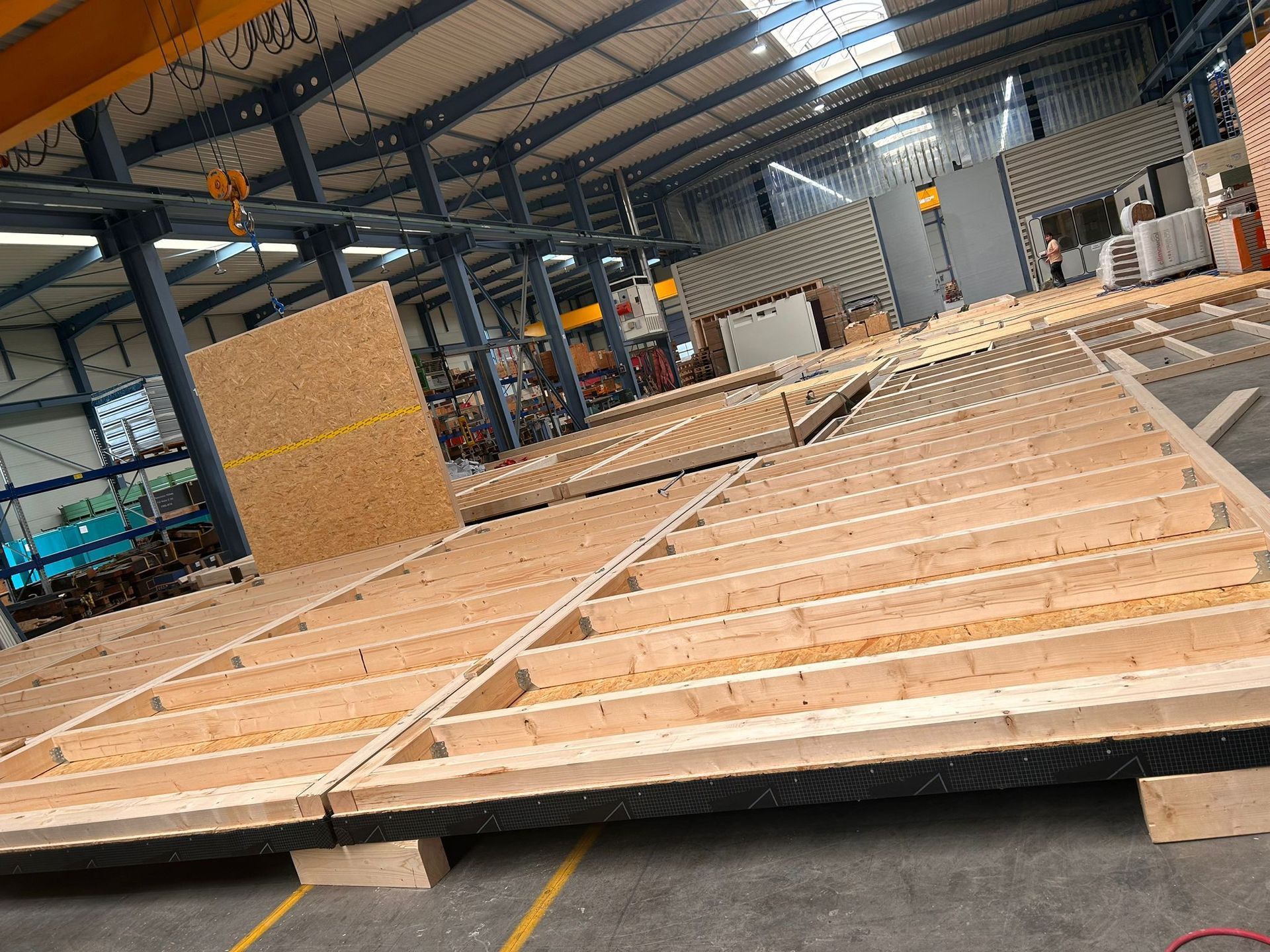 Nach Freigabe der Entwürfe und positiver Baugenehmigung beginnt die Konstruktion mit dem Holzrahmen der einzelnen Module. Für dieses Haus sind insg. 7 Module geplant.