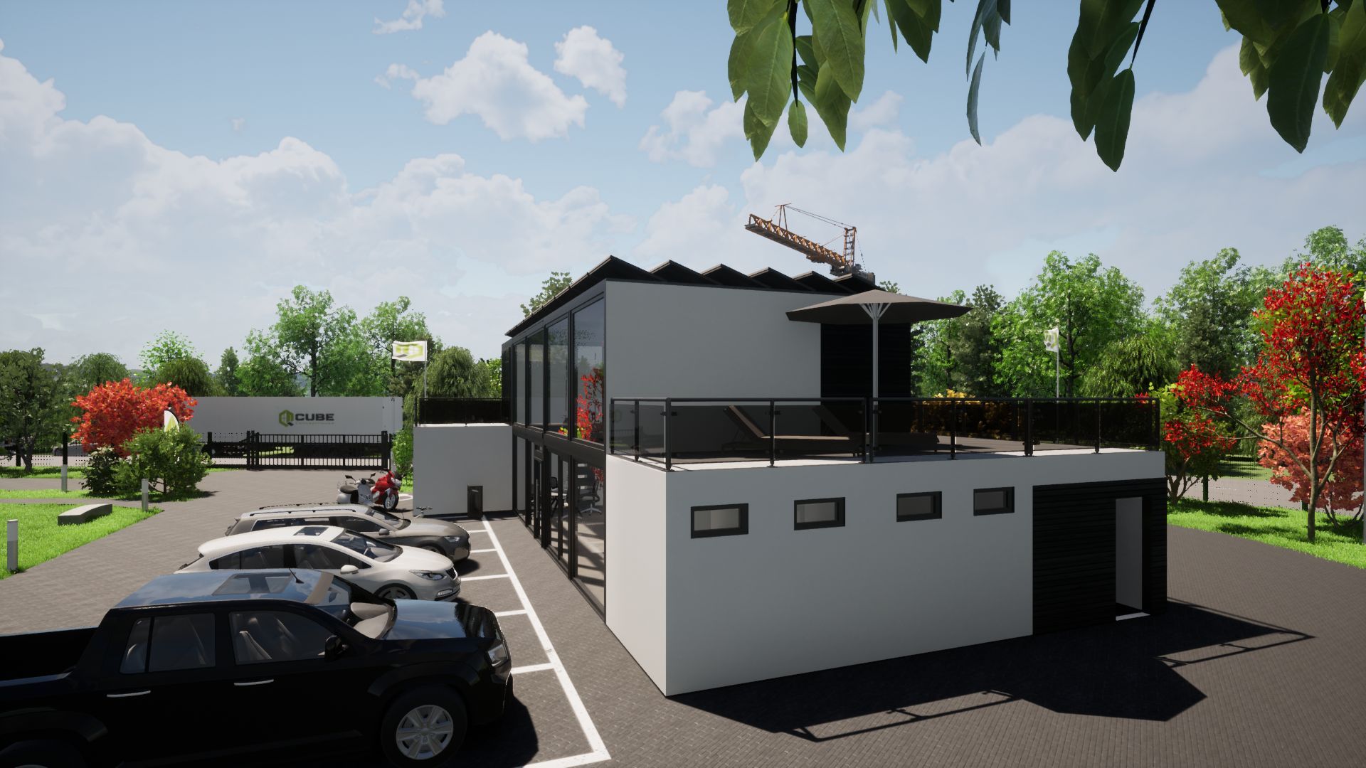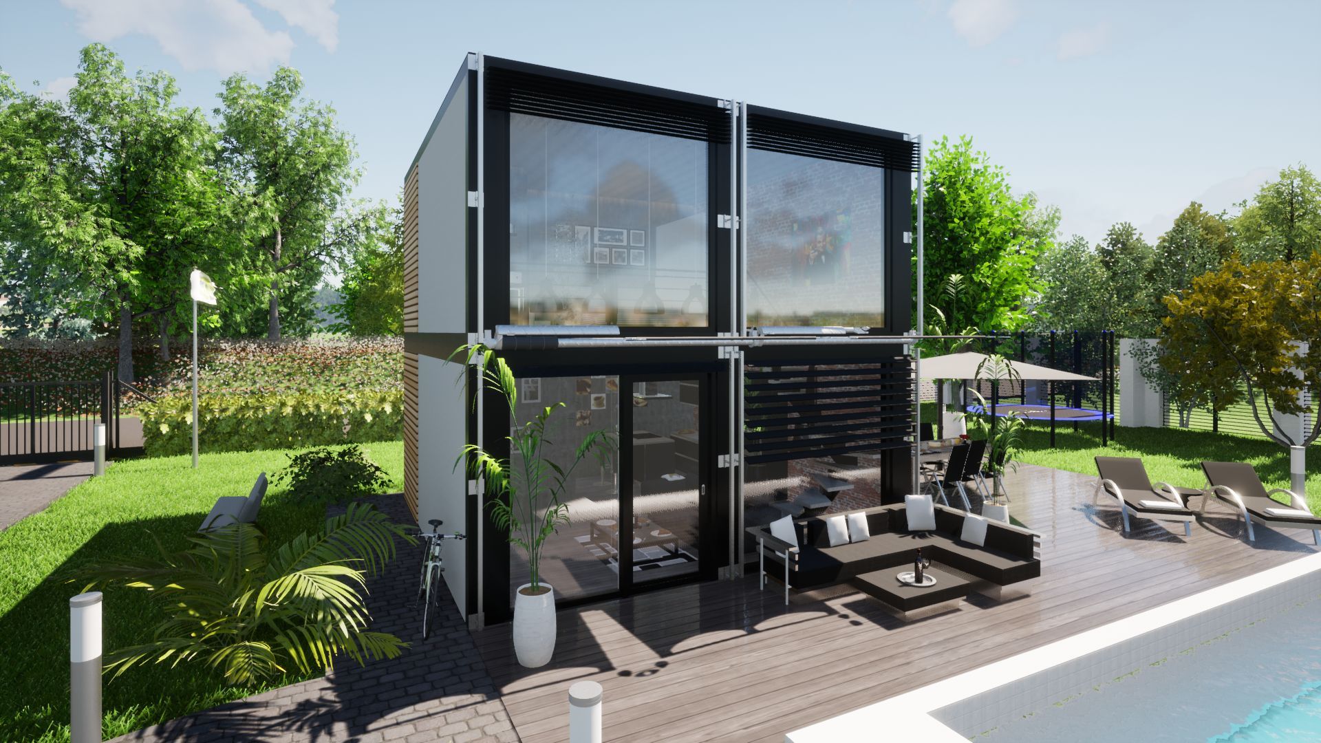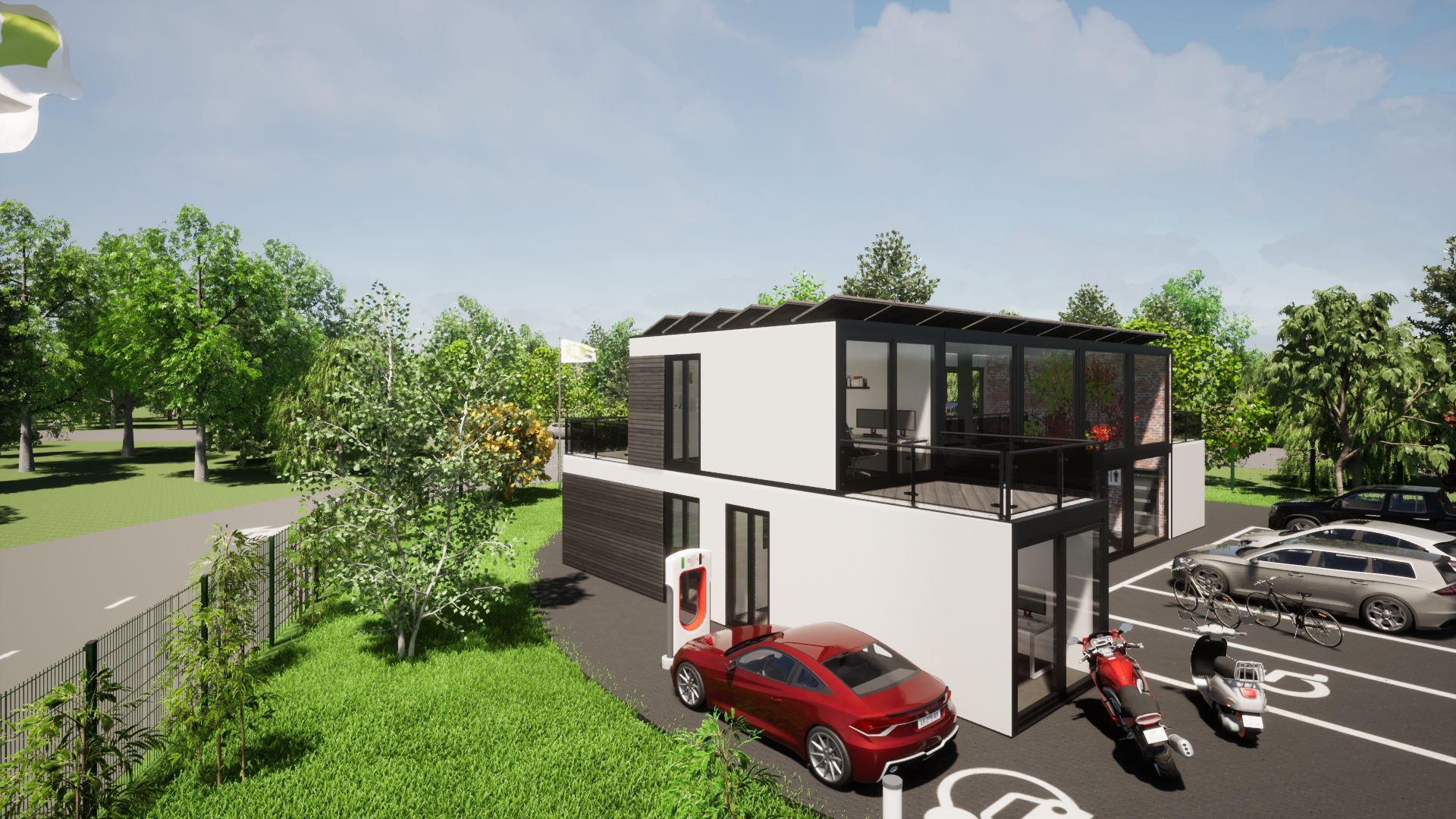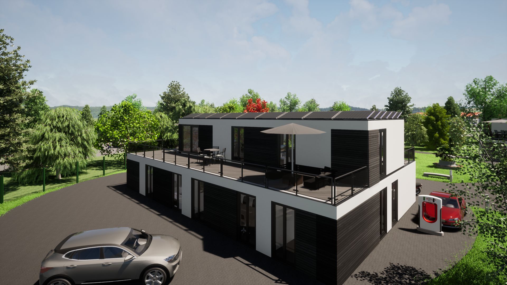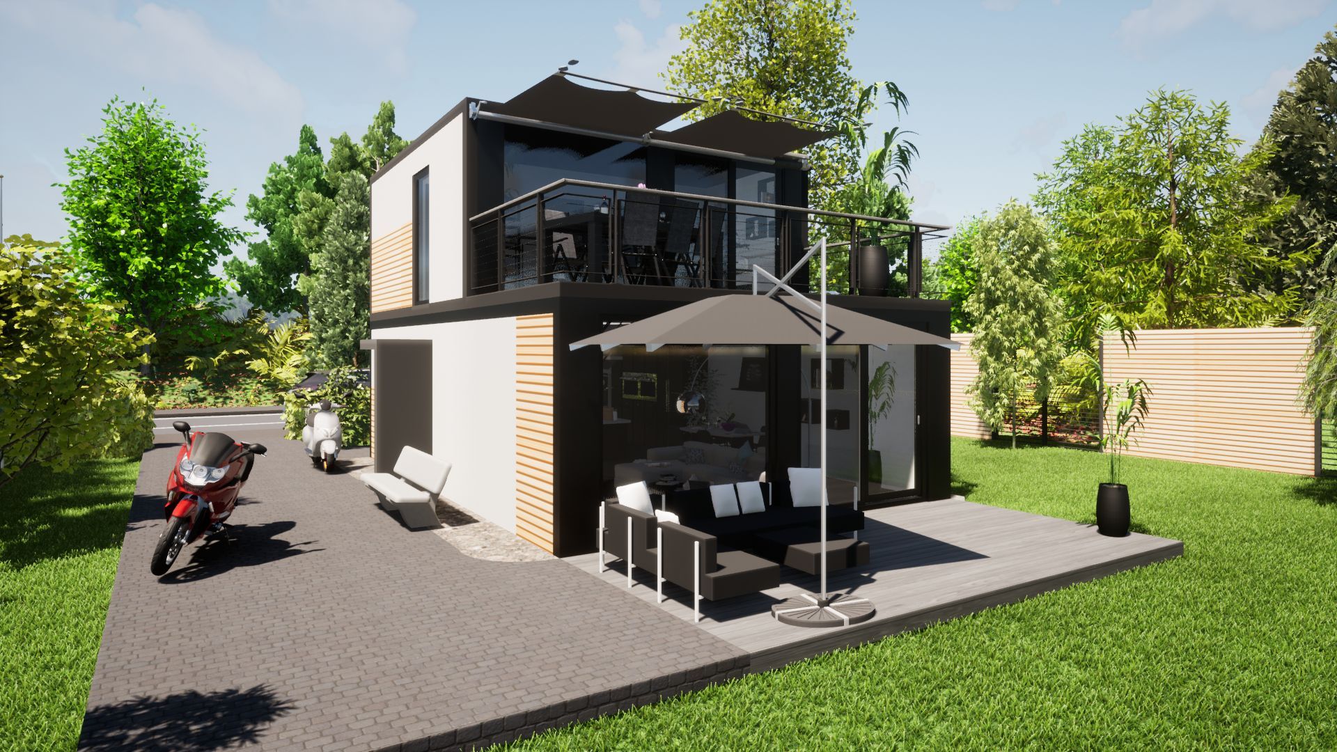 • Fassade: Lärche Rombusprofile, oder Weiß in Putzoptik mit Einfassung an Dach und den Ecken mit Aluminium Kantenprofilen
